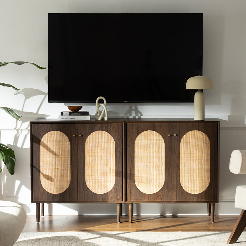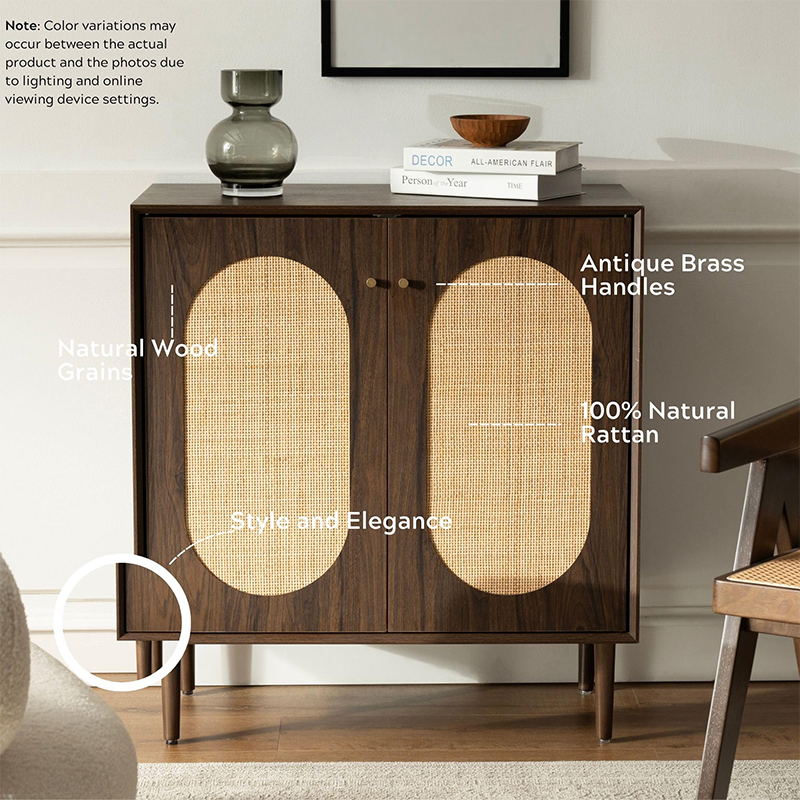 Bu dolabın en önemli avantajlarından biri işlevselliğidir. Geniş bir iç mekanı ortaya çıkarmak için açılan iki kapıya sahip bu dolap, kitaplar, giysiler ve ev malzemeleri de dahil olmak üzere çok çeşitli eşyaların saklanması için idealdir. Ayrıca kapılarda yer alan rattan detaylar her türlü dekoru tamamlayacak benzersiz ve şık bir dokunuş sunuyor.