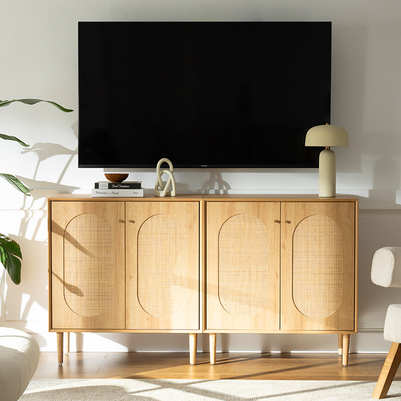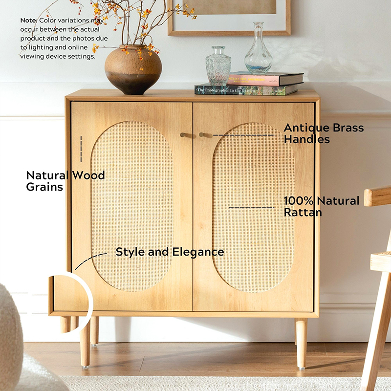 Bu dolabın en önemli avantajlarından biri işlevselliğidir. Geniş bir iç mekanı ortaya çıkarmak için açılan iki kapıya sahip bu dolap, kitaplar, giysiler ve ev malzemeleri de dahil olmak üzere çok çeşitli eşyaların saklanması için idealdir. Ayrıca kapılarda yer alan rattan detaylar her türlü dekoru tamamlayacak benzersiz ve şık bir dokunuş sunuyor.